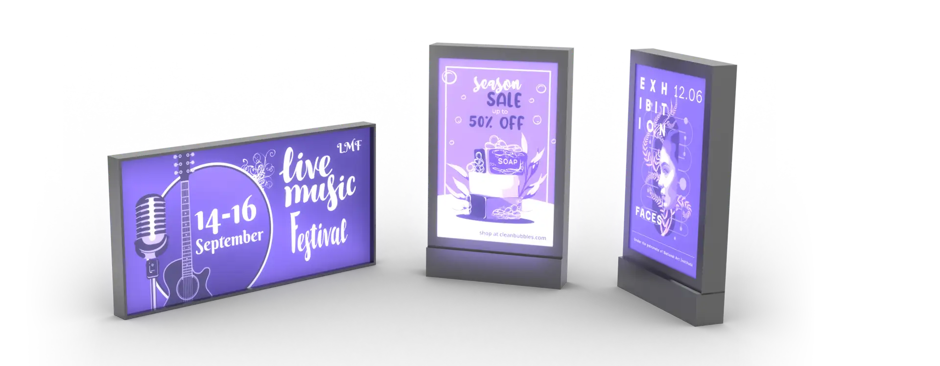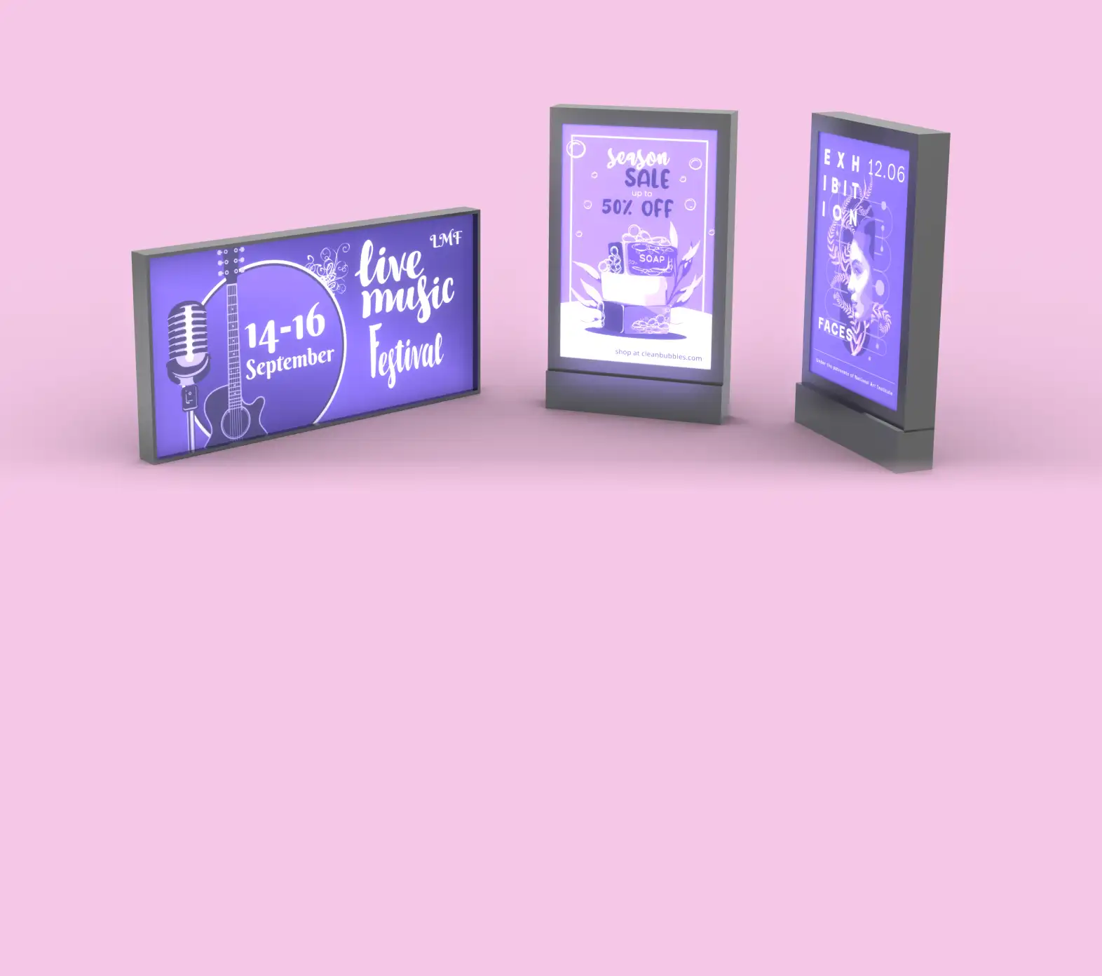 Plakat podświetlany jest od tyłu. Taki zabieg ożywia kolory i umożliwia czytanie nawet po zmroku.